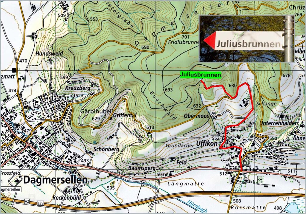 Hier sehen Sie die Wegbeschreibung ab der Kantonsstrasse in Uffikon. Sie können sich auch an den Wegweisern Juliusbrunnen orientieren.